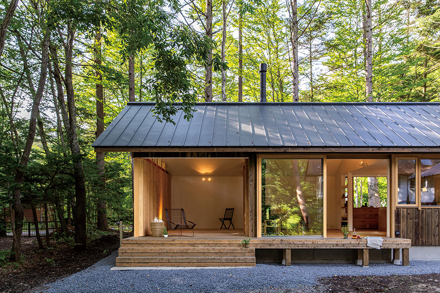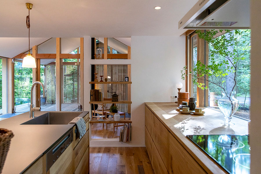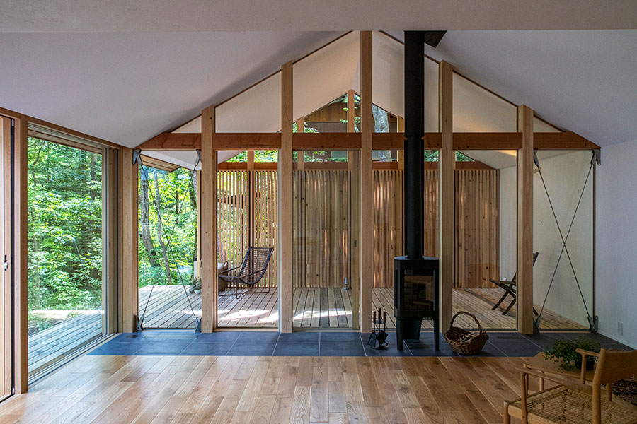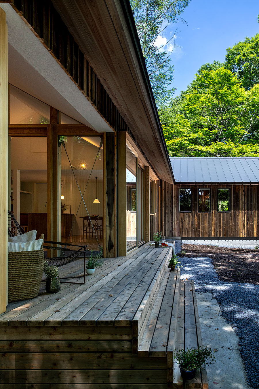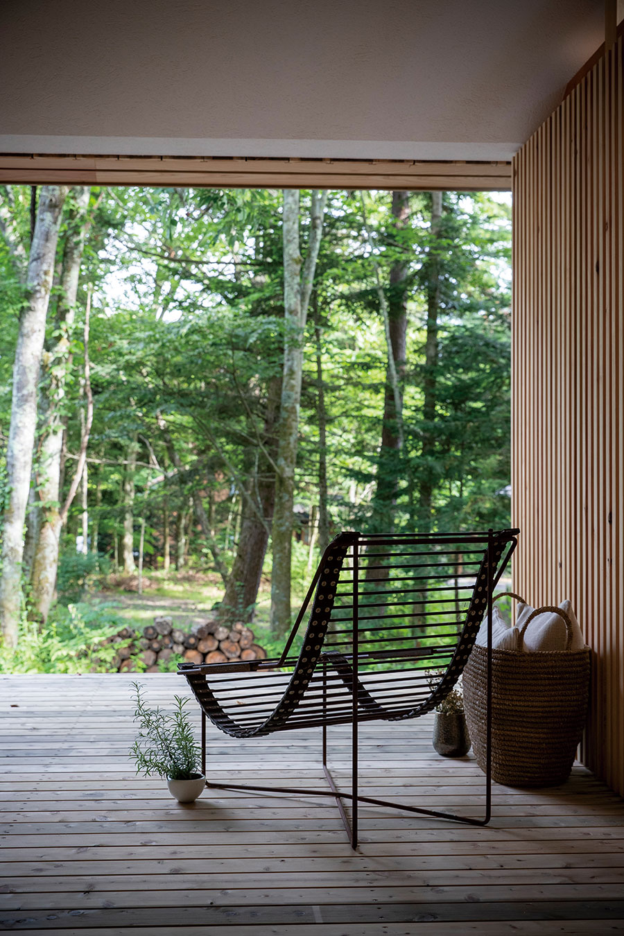 数字の一、そして「一つになる」を意味する言葉、EEN。EENのウッドデッキは格子と屋根で囲われた半屋外となっている。デッキチェアに腰掛ければ、家の中にいるような安心感と自然の中へ還るような開放感を同時に堪能できる。ウッドデッキからリビングダイニングに面する妻面一杯の開口部。そこからは、自然の息吹が家の隅々まで心地よく入り込んでいく。EENの中では自然がリズムを刻む。自然と家とあなたが、一つになっていく。