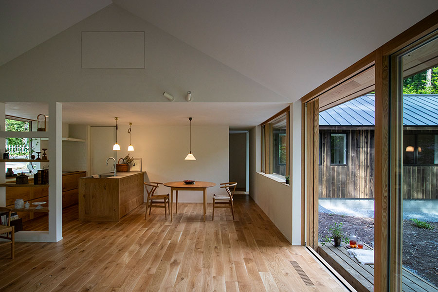 数字の一、そして「一つになる」を意味する言葉、EEN。EENのウッドデッキは格子と屋根で囲われた半屋外となっている。デッキチェアに腰掛ければ、家の中にいるような安心感と自然の中へ還るような開放感を同時に堪能できる。ウッドデッキからリビングダイニングに面する妻面一杯の開口部。そこからは、自然の息吹が家の隅々まで心地よく入り込んでいく。EENの中では自然がリズムを刻む。自然と家とあなたが、一つになっていく。